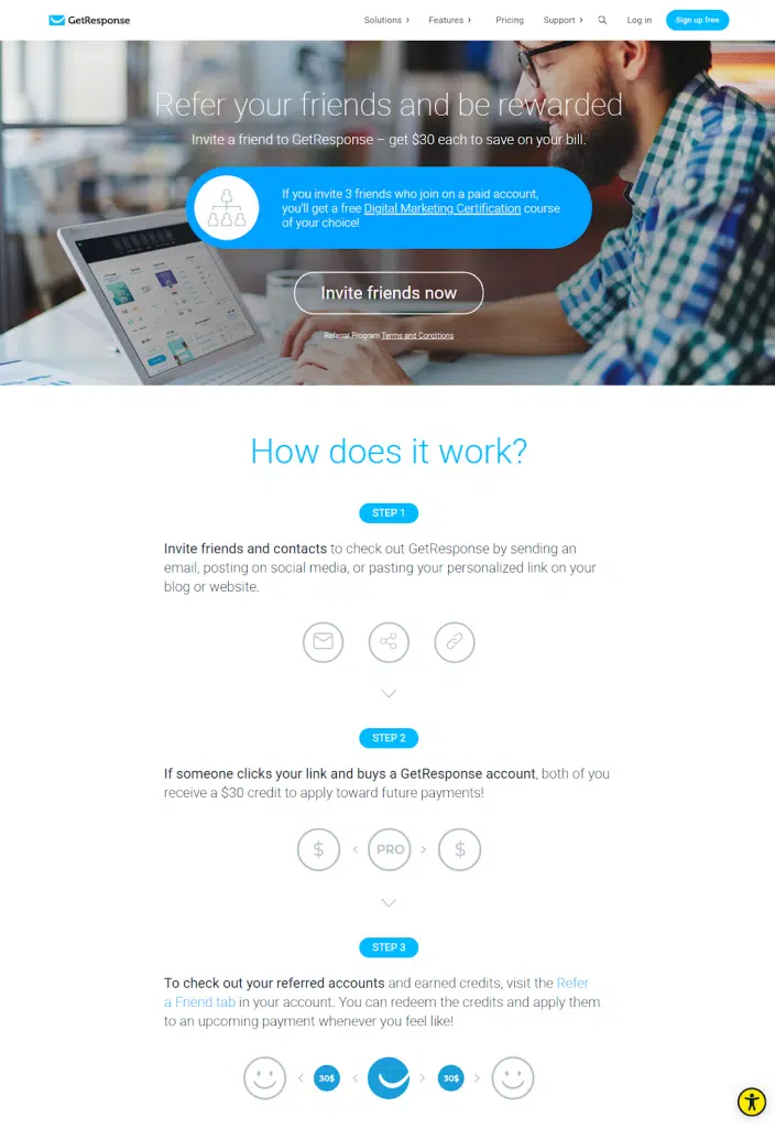 GetResponse is a marketing SaaS platform that helps brands grow through email campaigns. Their program works in tiers, and offers different rewards at each level.
